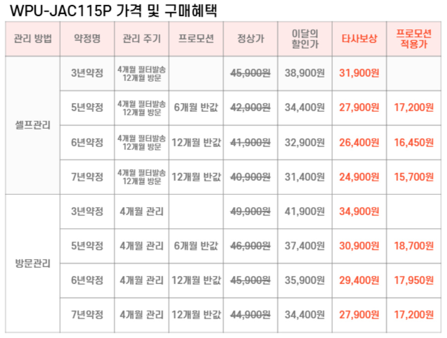 WPU-JAC115P SK매직 [SK매직] PSG 초소형 플러스 직수 정수기 제품분류 정수기 정수방식 직수형 타입 하프형 기능 냉온전용 AS기간 렌탈기간내 최저 렌탈가 월 24,900 (렌탈가) 제휴카드 할인가 월 (렌탈가) 3년 5년 6년 7년 셀프관리 방문관리/4개월 셀프관리(타사보상) 방문관리/4개월(타사보상) 제품색상 선택 네이비 + 0원 할인 제휴카드 보기 렌탈신청 장바구니