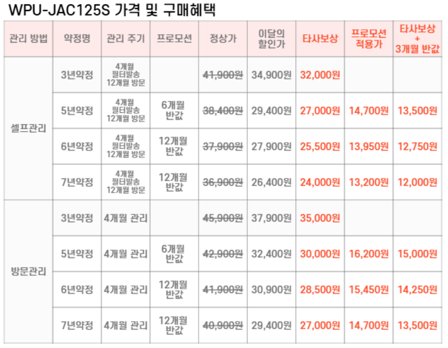WPU-JAC125S SK매직 [SK매직] 초소형 라이트 직수 냉온정수기 제품분류 정수기 정수방식 직수형 타입 하프형 기능 냉온전용 AS기간 렌탈기간내 최저 렌탈가 월 24,000 (렌탈가) 제휴카드 할인가 월 (렌탈가) 3년 5년 6년 7년 셀프관리 방문관리/4개월 셀프관리(타사보상) 방문관리/4개월(타사보상) 제품색상 선택 내추럴화이트 + 0원 소프트핑크 + 0원 바닐라베이지 + 0원 할인 제휴카드 보기 렌탈신청 장바구니