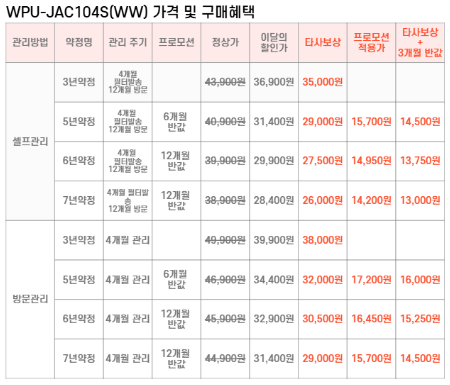 WPU-JAC104S(WW) SK매직 [SK매직] 초소형 직수 정수기 위글위글 제품분류 정수기 정수방식 직수형 타입 하프형 기능 냉온전용 AS기간 렌탈기간내 최저 렌탈가 월 26,000 (렌탈가) 제휴카드 할인가 월 (렌탈가) 3년 5년 6년 7년 셀프관리 방문관리/4개월 셀프관리(타사보상) 방문관리/4개월(타사보상) 제품색상 선택 위글 옐로우 + 0원 할인 제휴카드 보기 렌탈신청 장바구니