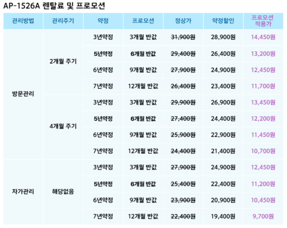 AP-1526A 코웨이 [코웨이] 스퀘어핏 공기청정기 15평형 제품분류 청정기 평형 11~20평 AS기간 렌탈기간내 최저 렌탈가 월 19,400 (렌탈가) 제휴카드 할인가 월 (렌탈가) 3년 5년 6년 7년 자가관리 방문관리/4개월 방문관리/2개월 제품색상 선택 샌드베이지 + 0원 퓨어화이트 + 0원 세이지그린 + 0원 페블그레이 + 0원 할인 제휴카드 보기 렌탈신청 장바구니