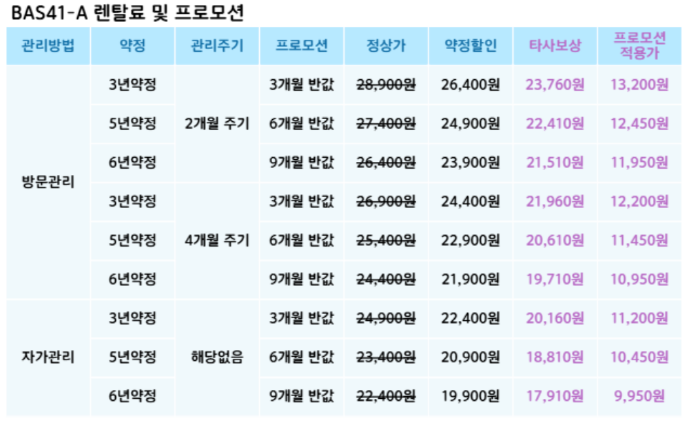 BAS41-A 코웨이 [코웨이] 스타일케어 비데 제품분류 비데 AS기간 렌탈기간내 최저 렌탈가 월 17,910 (렌탈가) 제휴카드 할인가 월 (렌탈가) 3년 5년 6년 자가관리 방문관리/4개월 자가관리(타사보상) 방문관리/4개월(타사보상) 제품색상 선택 핑크 + 0원 그린 + 0원 그레이 + 0원 할인 제휴카드 보기 렌탈신청 장바구니