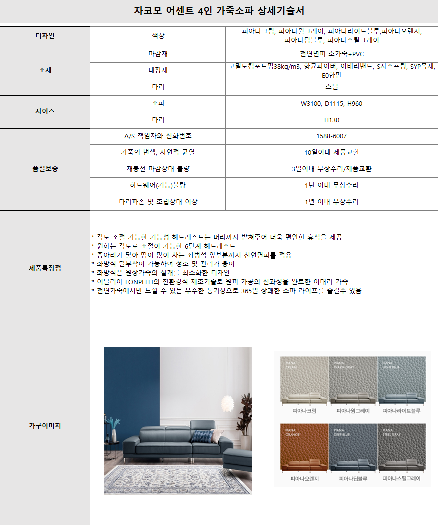어센트4 소노아임레디 [자모코] 어센트 4인 가죽소파 제품분류 가구/침대 구좌 6구좌 AS기간 1년 최저 렌탈가 월 99,000 (렌탈가) 제휴카드 할인가 월 (렌탈가) 1-200회 할인 제휴카드 보기 렌탈신청 장바구니
