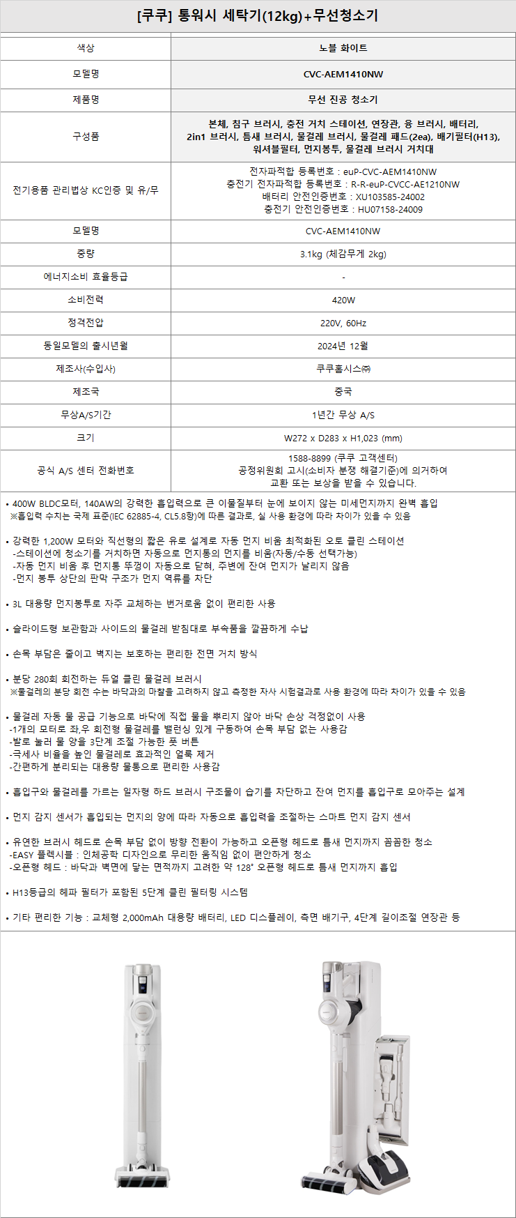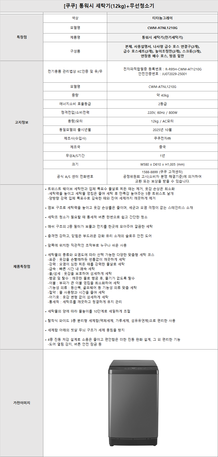 CWM-ATNL1210G + CVC-AEM1410NW 소노아임레디 [쿠쿠] 통워시 세탁기 12KG 티타늄그레이 + 무선청소기 제품분류 결합상품 구좌 2구좌 AS기간 1년 최저 렌탈가 월 33,000 (렌탈가) 제휴카드 할인가 월 (렌탈가) 1-200회 할인 제휴카드 보기 렌탈신청 장바구니