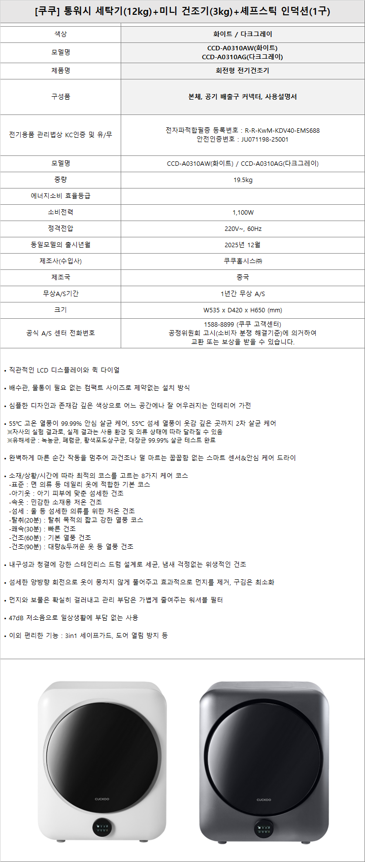 CWM-ATNL1210G + CCD-A0310AW/AG + CIR-DP103FW 소노아임레디 [쿠쿠] 통워시 세탁기 12KG 티타늄그레이 + 미니 건조기 3KG + 인덕션 1구 제품분류 결합상품 구좌 2구좌 AS기간 1년 최저 렌탈가 월 33,000 (렌탈가) 제휴카드 할인가 월 (렌탈가) 1-200회 건조기색상 선택 화이트 + 0원 다크그레이 + 0원 할인 제휴카드 보기 렌탈신청 장바구니