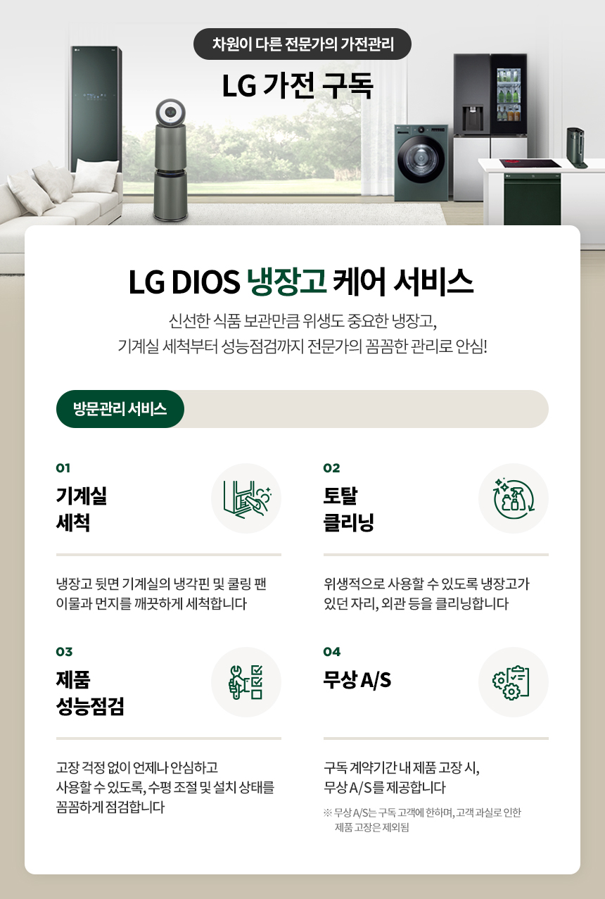 S834MEE141 LG전자구독 [LG] 디오스 AI 오브제컬렉션 매직스페이스 냉장고 832L 베이지 제품분류 냉장고 용량(총량) 800L이상 도어 5도어 AS기간 렌탈기간내 최저 렌탈가 월 45,900 (렌탈가) 제휴카드 할인가 월 (렌탈가) 3년 4년 5년 6년 관리주기 선택 방문관리/30개월 + 0원 할인 제휴카드 보기 렌탈신청 장바구니